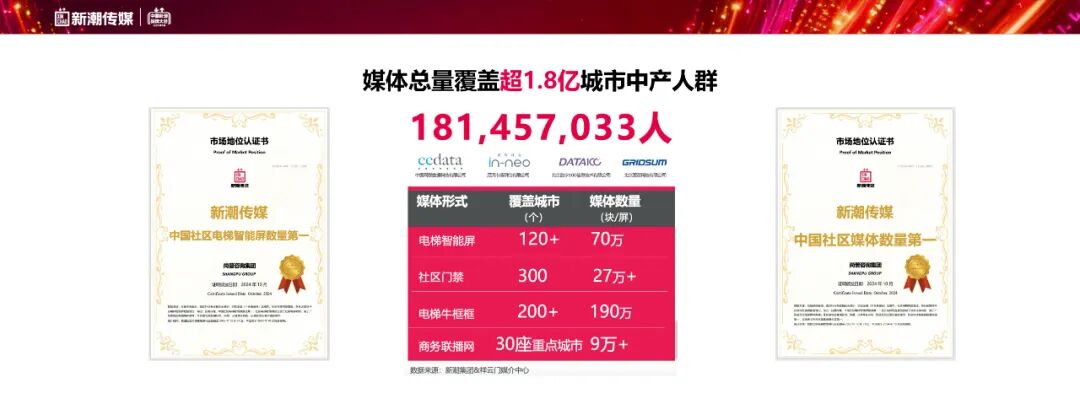 基于此,新潮传媒深度布局社区场景:在200余座城市覆盖70万部电梯智能屏,斩获“中国社区媒体数量第一”“中国社区电梯智能屏数量第一”双认证,并通过电梯广告、社区门禁广告等多元形式,实现对“有电梯社区”与“无电梯社区”的全场景覆盖,为品牌搭建起“从触达至转化”的社区营销闭环。