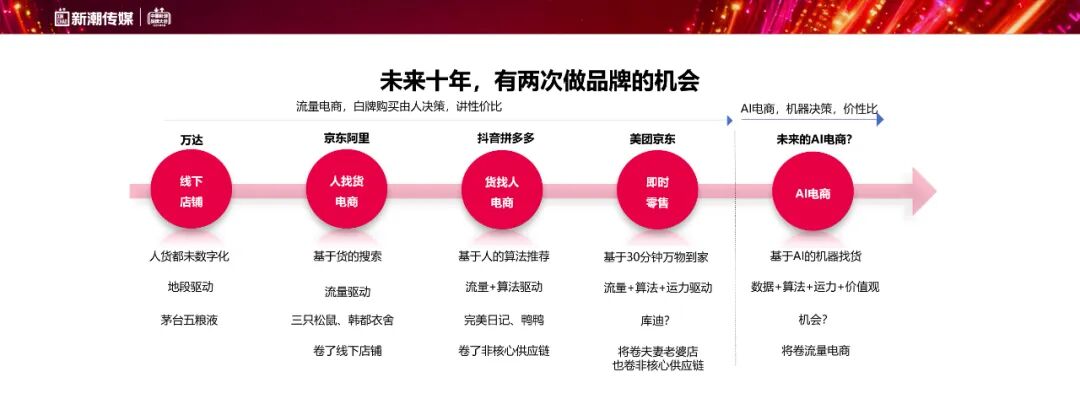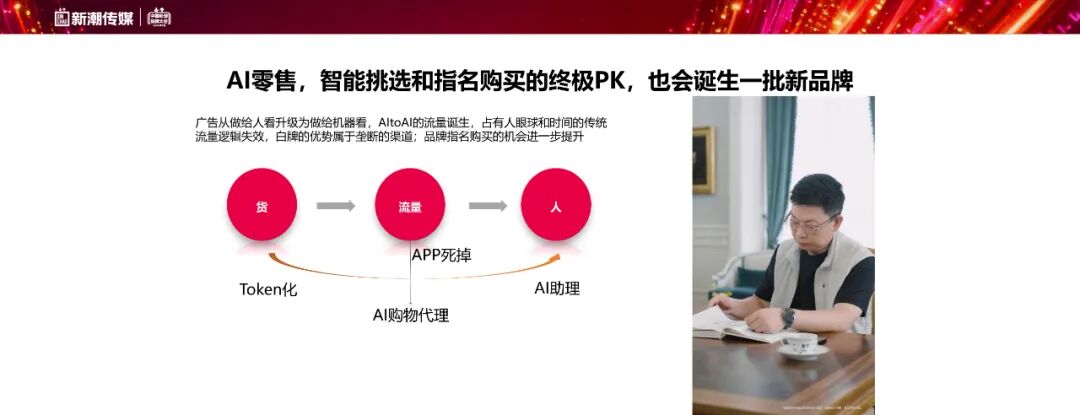 迅速崛起的AI电商,将彻底颠覆流量电商逻辑——从 "性价比" 转向 "价性比",也将成就一批新的品牌。同时,广告模式也在不断迭代,广告从做给人看升级为做给机器看,AItoAI的流量诞生,占有人眼球和时间的传统流量逻辑失效。“AI电商时代更是指名购买,因为如果不是指名购买的产品会被你的AI助理替代,它帮你决策,只有指名购买才会抗AI,今天我们要抗流量,未来我们还要抗AI。”所以,具备“指名购买”的品牌会迎来更大的增长机会。